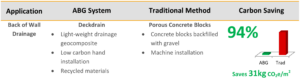 The alternative to transportation and delivery of hollow concrete blocks for external back of wall drainage, represents an impressive carbon saving of 94%.